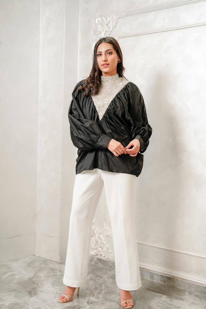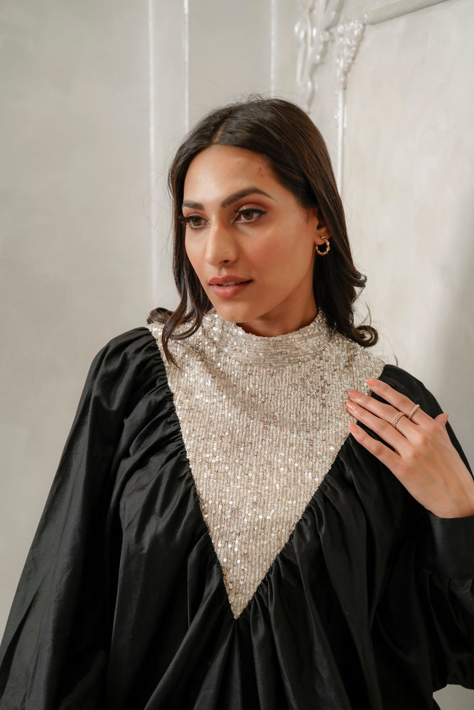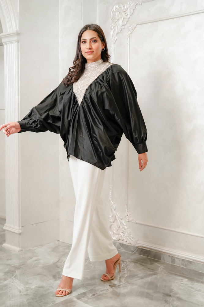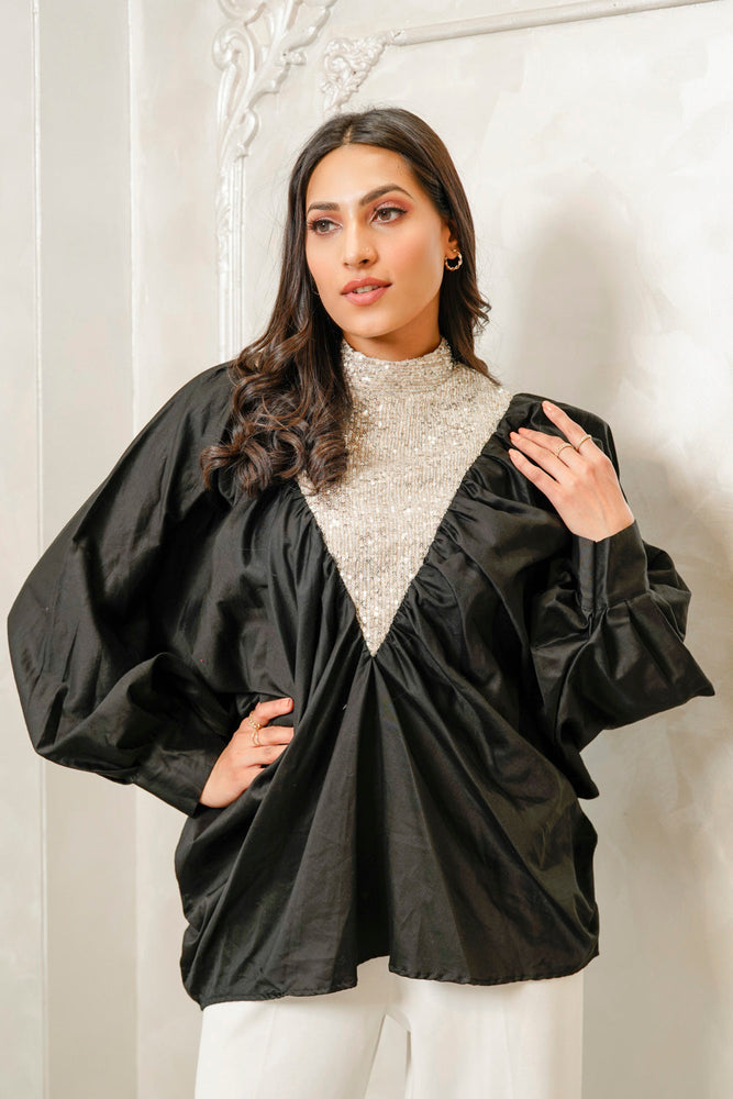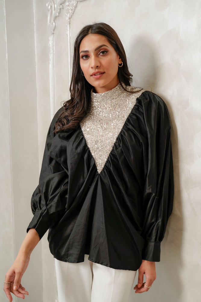 Black oversized top with a deep V neck silver sequence cut out. Full of gathers compliment its silhouette.
