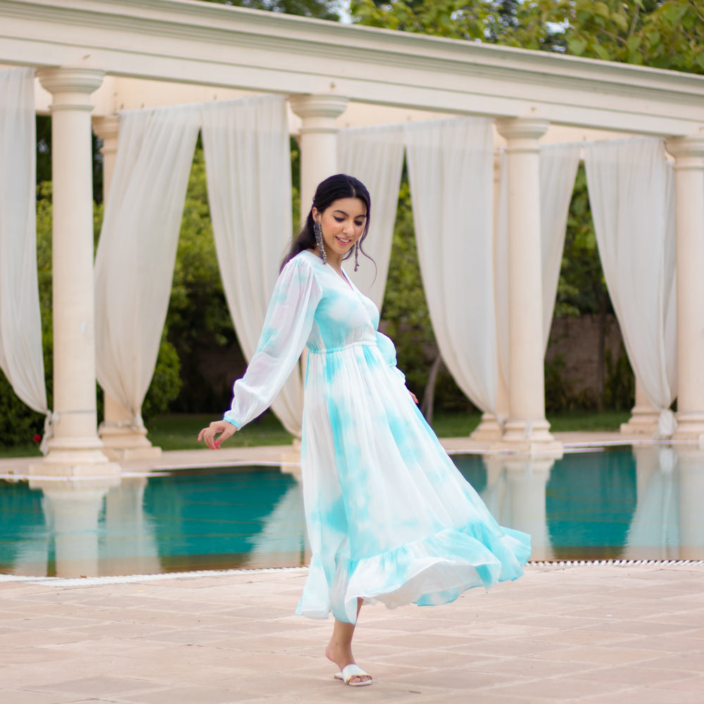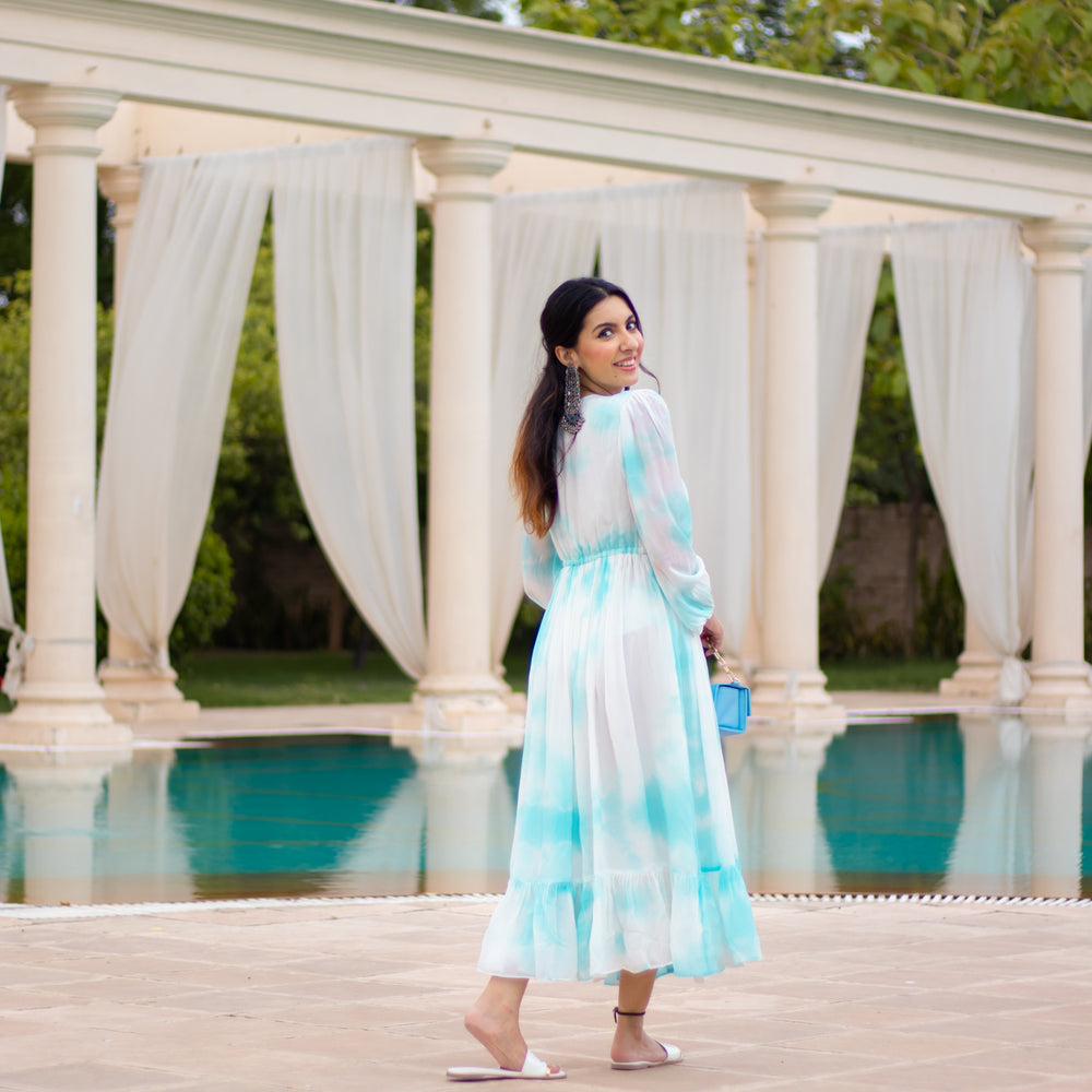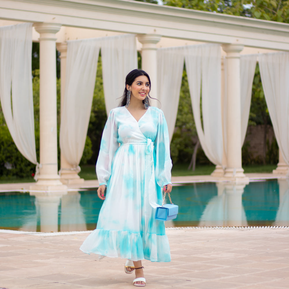 Angrakha Midi Dress With Gathered Flare With One Layer, & Waist BeltHandDye - Yes